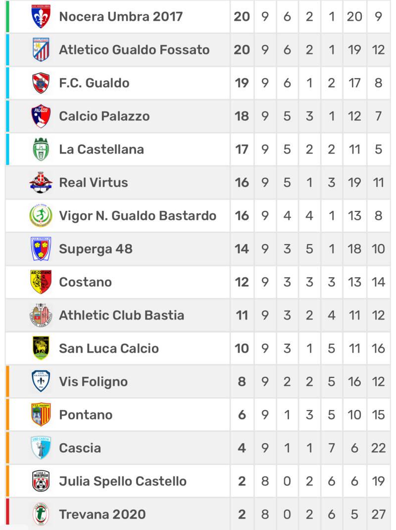 Dopo 9 giornate il bilancio è sicuramente positivo, anche se i ragazzi di mister Baciucco si sono visti sfumare la vittoria in ben 5 occasioni (4 V,4 P, 1 S), di cui in almeno 3 di esse avrebbero meritato sicuramente di più. Sono 16 i punti raccolti in 9 giornate, che ci fanno piazzare al 6° posto insieme alla Real Virtus, a 1 punto dal quinto posto e a 4 dal primo. Terza miglior difesa con 8 reti subite, e settimo miglior attacco con 13 gol realizzati, di cui 7 fatti dal nostro fuoriclasse Alessandro Tomassoni (2° capocannoniere del campionato). Di seguito i risultati delle prime nove gare: